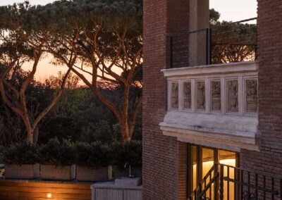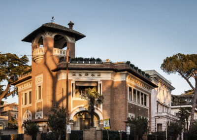 A Liberty-style building heavily influenced by Greco-Roman architecture. This deluxe villa was restored by renowned architect and pays homage to Italy’s Roman roots with elaborate painted ceilings, ornate mosaics and elegant marble floors. The villa was conceived by an Italian engineer in the 1910ties, who was involved in the development of the residential area called Quartiere Sebastiani later part of the prestigious Parioli district. The last details were completed in 1929. The Liberty style building, which has been much affected by the classical Greek-Roman architecture, is set over four floors with an additional annexe. In the beginning it was used as the primary residence of a wealthy noble Italian family.