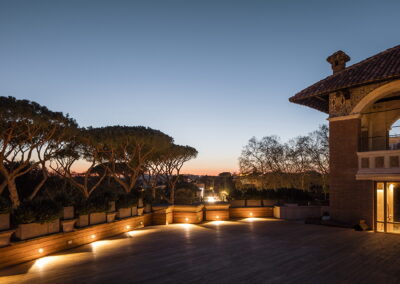 The lower ground floor is entirely dedicated to well-being and features a gym, pool, massage room and a hammam. The ground floor houses a fully equipped kitchen and two double bedrooms, each with an en-suite bathroom. On the first floor are most of the social spaces including the dining room, library, breakfast room, entrance hall and a living room with a grand piano. The remaining two bedrooms are on the upper floor and both feature a double bed and an en-suite bathroom. All guests have unlimited access to the rooftop terrace with a 360 degree panoramic view of Rome with solarium, a Jacuzzi, an outdoor shower and an alfresco dining area, furnished for relaxing and with a jacuzzi that encourage al fresco living.