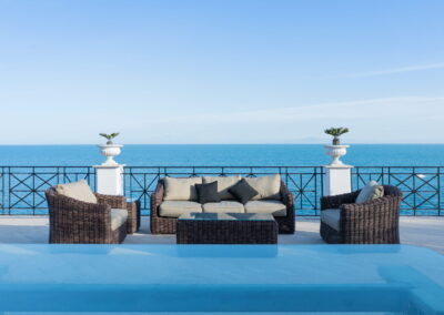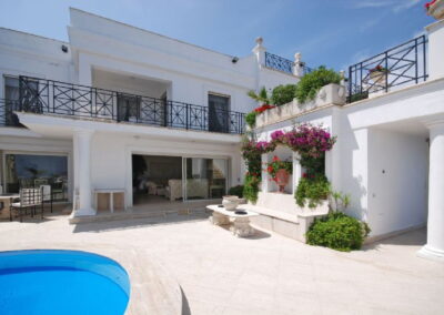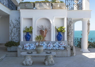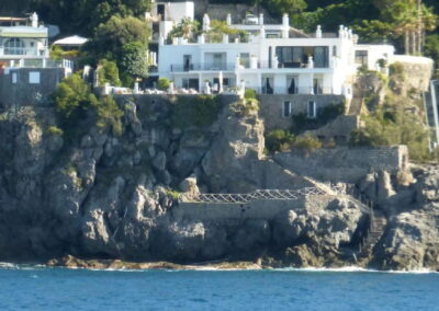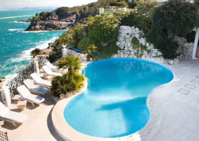 The villa lies about 20 minutes by car from the port of Ischia, and from there Naples can be reached in about an hour by ferry with your car on board and in about 40 minutes by hydrofoil. Villa La Scogliera nests in the cliffs on the promontory called “Punta Caruso” in a unique position among copses of Mediterranean scrub, large panoramic terraces and rocks that have been carefully worked to allow easy access to the crystal-clear sea. This property is a splendid two-story villa located on a hillside, facing the sea. with an internal surface of 600 sq. m., including 2 different and charming separate Annexes.