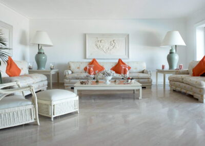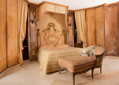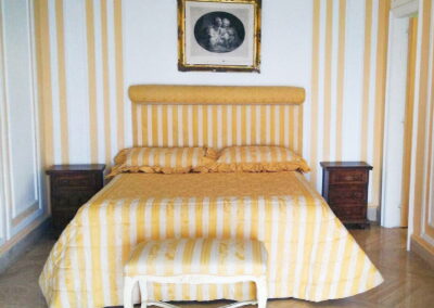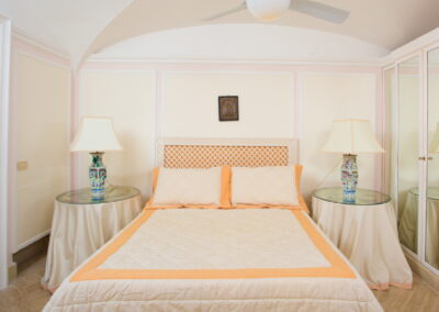 The décor and quality of the furniture is superb; detailed and carefully selected to the highest standards; as soon as you go through the entrance you will notice the quality of the architecture and of the furnishings, which consist entirely of antiques, alternating with modern accessories such as the sofas and comfortable chairs. Every room has been decorated with valuable tapestries and large mirrors, and all of the living areas have been organized with taste and an eye for the practical. Immersed in a beautiful green garden, the ground floor of the property offers a hall, opening onto a majestic living area. The space is cosy and welcoming and is furnished with two large sofas and a table, containing marble floors, a fireplace (for decorative purposes only) with antique ceramic tiles, flat screen SAT-TV and large, sliding glass doors opening onto the main terrace surrounding the house. Six bedrooms are located on the ground floor, bedrooms 7th and 8th are in a separate annex. The villa possesses six and comfortable and warmly decorated, air-conditioned bedrooms. The master bedroom (n.1) access from the living area, has been furnished with king size bed, large dresser, telephone, TV and has a private En-suite bathroom and access to a small private terrace. (Important notice: members of your party might need to walk through this bedroom to reach the second bedroom – they can avoid going through this room by entering from the garden). The second double bedroom has a large wardrobe, En-suite bathroom with shower (you will be able to enter the second bedroom from the garden, through an external access or passing from the master bedroom). The living room leads to a corridor where the other 5 bedrooms can be found. A pair of rooms, all with king size beds, all enjoy air conditioning, 4 with En-suite bathrooms, access to the main terrace.