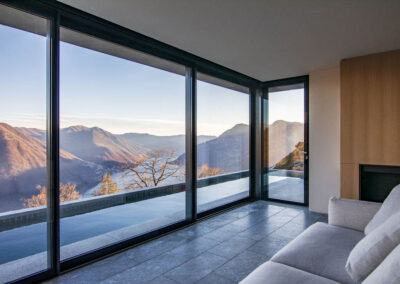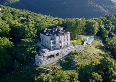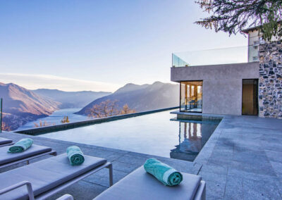 At 881 metres above the lake and with no immediate neighbours, Villa Peduzzi is an oasis of calm. The villa sits in lush gardens of 4.5 acres offering the peace and tranquillity that is so difficult to find on Lake Como. The views from south facing Villa Peduzzi are truly stunning – a combination of wide blue lake and green mountain vistas, rounded off with glorious golden sunsets. These can be enjoyed from the balconies off every bedroom, the villa’s main surround terrace and the extraordinary pool house with its green roof and infinity pool. Also making the most of this aspect are an exceptional yoga/wellness room that has been carved out of the cliff face and the roof top terraces, bar and entertainment area. Yet the pretty perched mountain village of Pigra is only 300 metres away and the popular lakeside village of Argegno can be reached within 4 minutes from the cable car station located 500 metres from the villa gates. Pigra has a couple of restaurants and is a perfect base for hiking and mountain biking. Argegno provides a wide range of restaurants, our own private boat mooring and a scheduled river taxi service, ideal for exploring all that Lake Como has to offer.