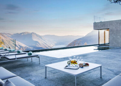 At 881 metres above the lake and with no immediate neighbours, Villa Peduzzi, a former medieval watchtower now fully restored, is an oasis of calm. The villa sits in lush gardens of 4.5 acres, the views from south facing Villa Peduzzi are truly stunning – a combination of wide blue lake and green mountain vistas, which can be enjoyed from the balconies off every bedroom, the villa’s main surround terrace and the extraordinary pool house with its green roof and infinity heated pool. An exceptional yoga/wellness room that has been carved out of the cliff face and the rooftop terraces, bar and entertainment area. The villa has is own luxury boat moored at the bottom of the funicular in Argegno