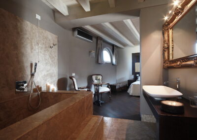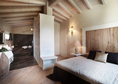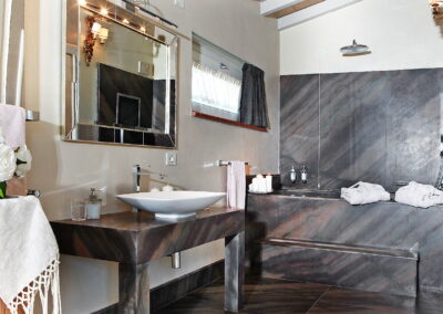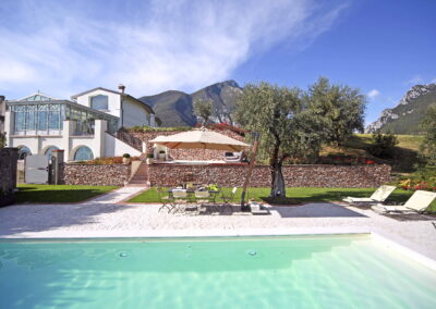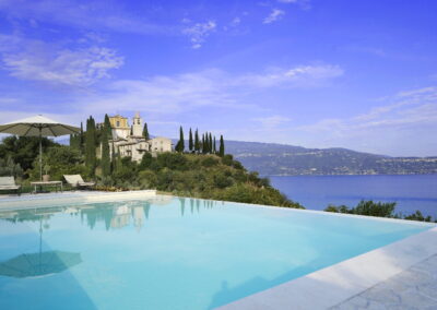 Villa Sentore is located 300 m above sea level, is surrounded by hectares of olive cultivation, an almost unique condition in the Lake Garda area. Villa Sentore has three master bedroom suites to welcome our guests. These suites consist of large rooms fitted with every comfort, boasting a private open space bathroom where guests can make use of a large shower and bathtub for relaxing moments. Every room has been finished and personalized in every detail; marble, elegant wooden decorations, sheets and sponges made of precious textiles and stylish furniture have been chosen and matched with care to exalt every bedroom. The Villa also has a spacious living room, dining room and kitchen. These are located within the characteristically elegant and sophisticated iron and glass conservatory facing the lake, which, through its glass surfaces, allows in not only the light, but also the intense colors of nature to blend in and create a unique atmosphere. The white ceiling curtains made of fine linen gauze give a touch of refinement. Here, the guests of the Villa can enjoy an ideal space table for elegant lunches and dinners, prepared in the kitchen, which is located behind the dining room. Villa Sentore features a nice wellness area overlooking the garden and the lake. Here you will find a large whirlpool tub where you can immerse yourself for a revitalizing bath. There is also a Finnish sauna, large shower and an area with comfortable beds ideal for relax. The quality materials and soft colors make the atmosphere ideal to indulge in relaxing massages and beauty treatments, booked and performed at the request of the customer. Surrounded by a unique landscape, immersed in the greenery lies the large infinity pool (6×10) sterilized by a natural salt-based treatment. The outdoor environment of the villa offers a large whirlpool tub set in the stone wall and an area around the pool equipped with deck chairs and tables for al fresco dining. The garden is filled with flowerbeds with essences and scented flowerings and by the expanse of the olive grove.